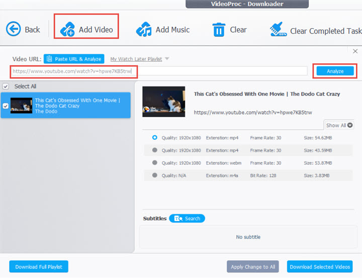 Step 3. After you enter the VideoProc Converter's Downloader feature, click the Add Video button to input the JW Player video link address which we have copied in the first step. Then click the Analyze button.
