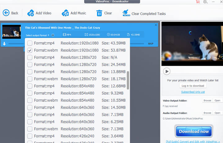 Step 4. After VideoProc Converter finishes the analyzing process, it will show you the JW Player video. Now choose the resolution which you like if VideoProc Converter finds several resolution options for you and click on the Download Now button to save it on your computer.